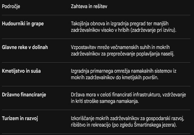 Zahtevamo takojšnjo obnovo in izgradnjo manjših zadrževalnikov, lesenih in kamnitih pregrad ter naravnih zajezevitev na vseh hudourniških območjih.